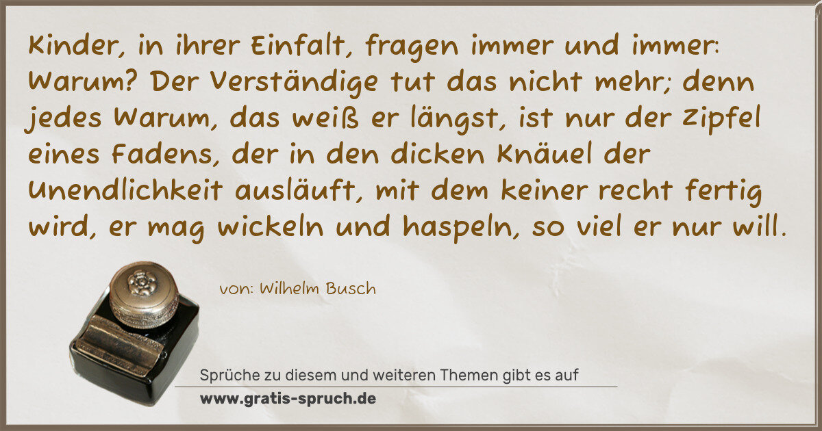 Kinder, in ihrer Einfalt, fragen immer und immer: Warum? Der Verständige tut das nicht mehr; denn jedes Warum, das weiß er längst, ist nur der Zipfel eines Fadens, der in den dicken Knäuel der Unendlichkeit ausläuft, mit dem keiner recht fertig wird, er mag wickeln und haspeln, so viel er nur will.