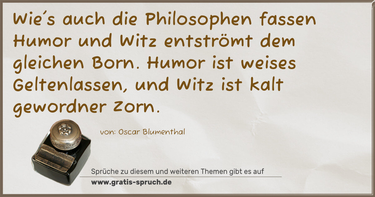 Wie's auch die Philosophen fassen Humor und Witz entströmt dem gleichen Born. Humor ist weises Geltenlassen, und Witz ist kalt gewordner Zorn.
