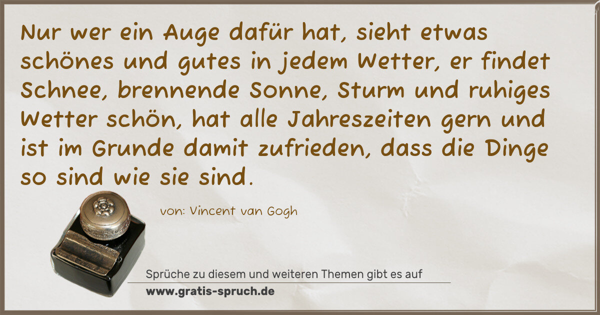 Nur wer ein Auge dafür hat, sieht etwas schönes und gutes in jedem Wetter, er findet Schnee, brennende Sonne, Sturm und ruhiges Wetter schön, hat alle Jahreszeiten gern und ist im Grunde damit zufrieden, dass die Dinge so sind wie sie sind.