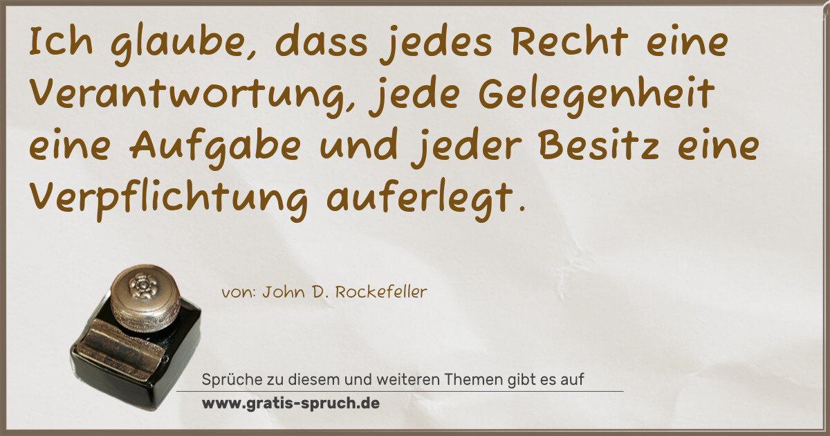 Ich glaube, dass jedes Recht eine Verantwortung, jede Gelegenheit eine Aufgabe und jeder Besitz eine Verpflichtung auferlegt.