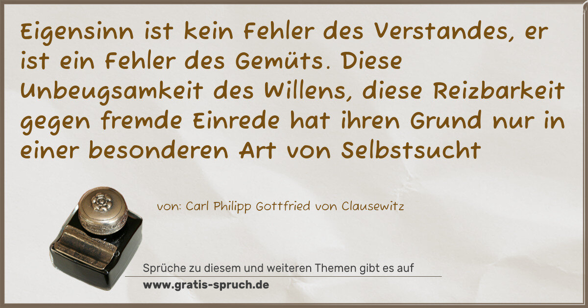 Eigensinn ist kein Fehler des Verstandes, er ist ein Fehler des Gemüts. Diese Unbeugsamkeit des Willens, diese Reizbarkeit gegen fremde Einrede hat ihren Grund nur in einer besonderen Art von Selbstsucht