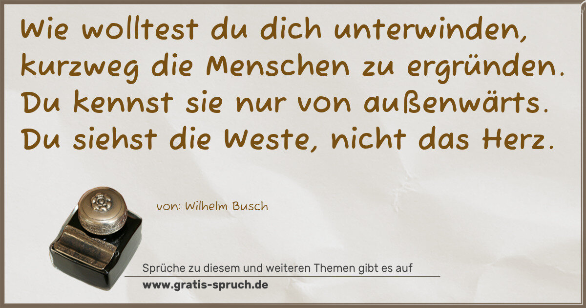 Wie wolltest du dich unterwinden, kurzweg die Menschen zu ergründen. Du kennst sie nur von außenwärts. Du siehst die Weste, nicht das Herz.