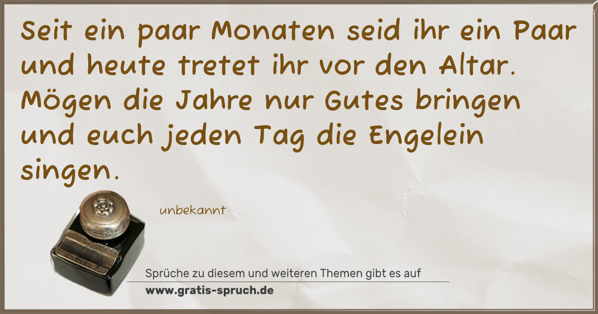 Seit ein paar Monaten seid ihr ein Paar und heute tretet ihr vor den Altar. Mögen die Jahre nur Gutes bringen und euch jeden Tag die Engelein singen.