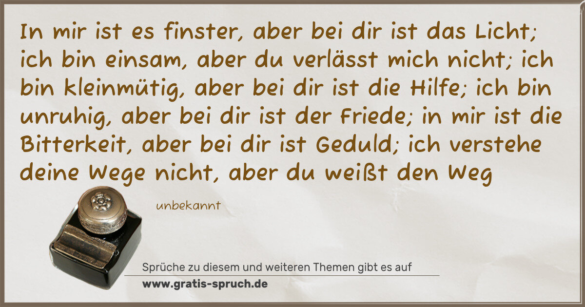 In mir ist es finster, aber bei dir ist das Licht; ich bin einsam, aber du verlässt mich nicht; ich bin kleinmütig, aber bei dir ist die Hilfe; ich bin unruhig, aber bei dir ist der Friede; in mir ist die Bitterkeit, aber bei dir ist Geduld; ich verstehe deine Wege nicht, aber du weißt den Weg