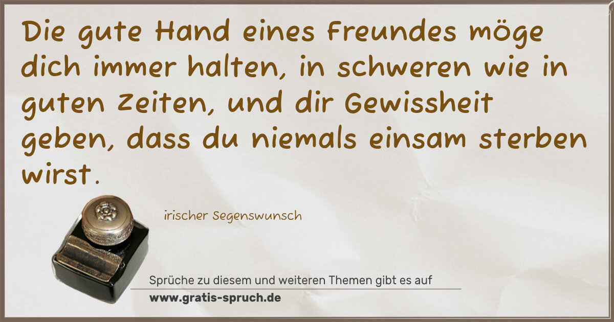 Die gute Hand eines Freundes möge dich immer halten, in schweren wie in guten Zeiten, und dir Gewissheit geben, dass du niemals einsam sterben wirst.