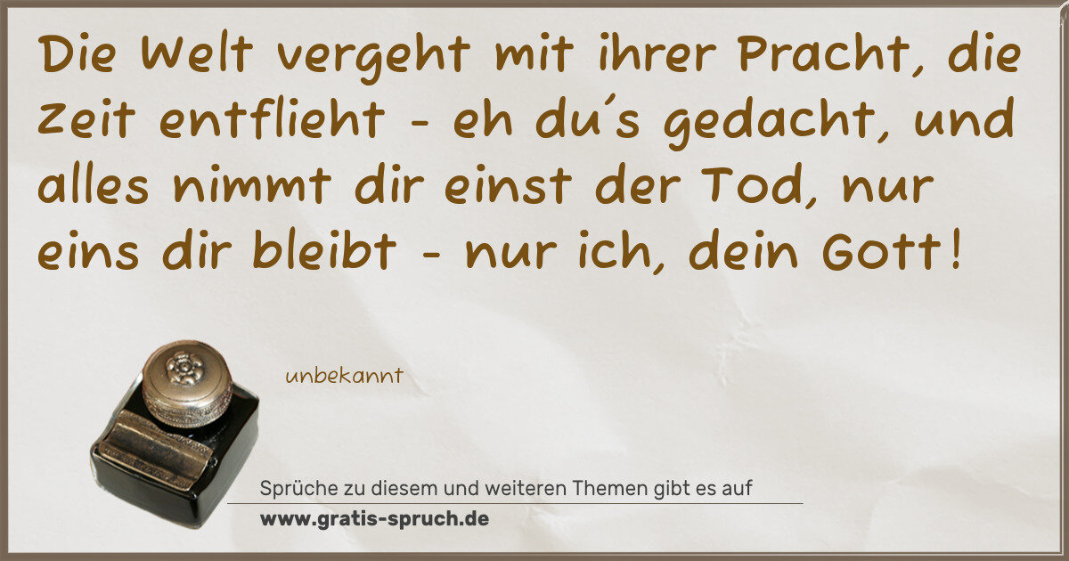 Die Welt vergeht mit ihrer Pracht, die Zeit entflieht - eh du's gedacht, und alles nimmt dir einst der Tod, nur eins dir bleibt - nur ich, dein Gott!