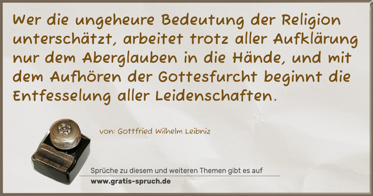 Wer die ungeheure Bedeutung der Religion unterschätzt, arbeitet trotz aller Aufklärung nur dem Aberglauben in die Hände, und mit dem Aufhören der Gottesfurcht beginnt die Entfesselung aller Leidenschaften.