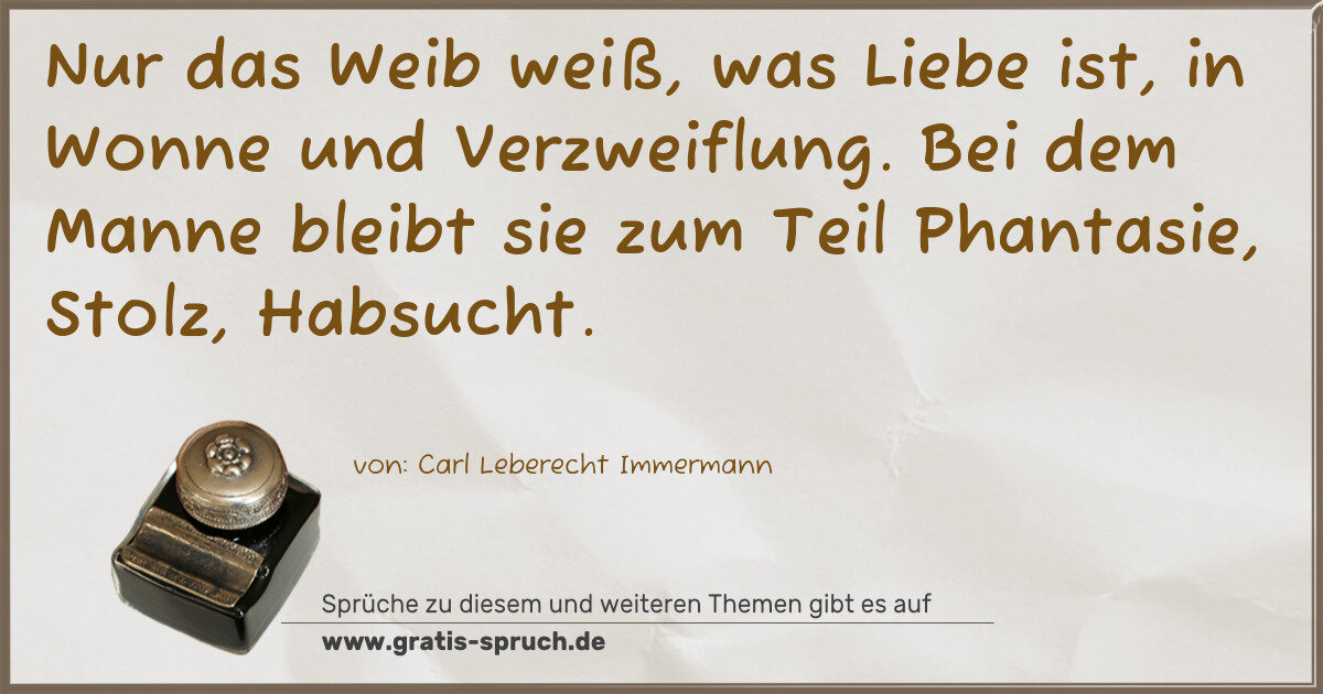 Nur das Weib weiß, was Liebe ist, in Wonne und Verzweiflung. Bei dem Manne bleibt sie zum Teil Phantasie, Stolz, Habsucht.