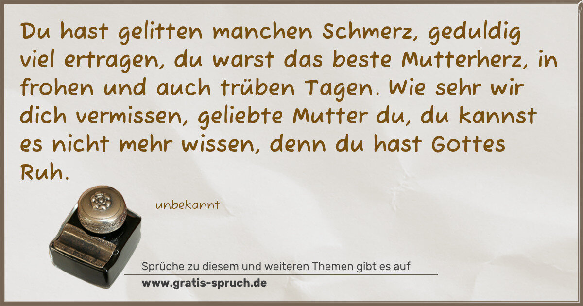 Du hast gelitten manchen Schmerz, geduldig viel ertragen, du warst das beste Mutterherz, in frohen und auch trüben Tagen. Wie sehr wir dich vermissen, geliebte Mutter du, du kannst es nicht mehr wissen, denn du hast Gottes Ruh.