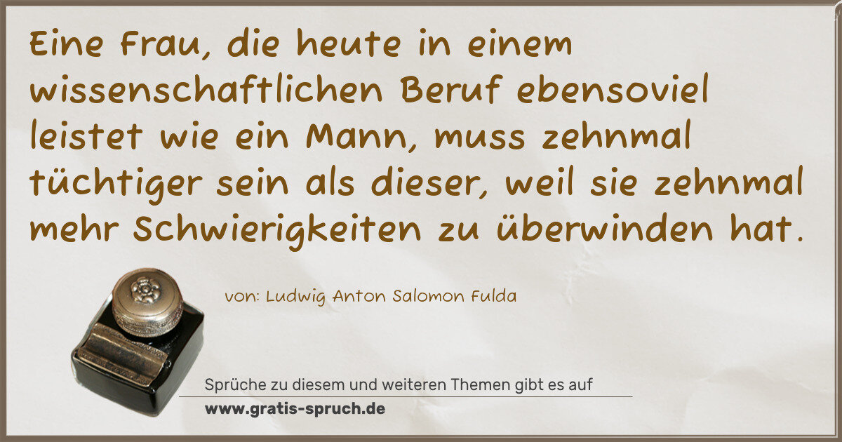 Eine Frau, die heute in einem wissenschaftlichen Beruf ebensoviel leistet wie ein Mann, muss zehnmal tüchtiger sein als dieser, weil sie zehnmal mehr Schwierigkeiten zu überwinden hat.