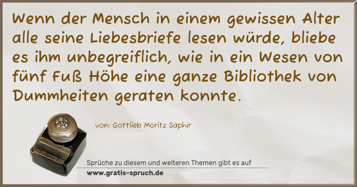 Wenn der Mensch in einem gewissen Alter alle seine Liebesbriefe lesen würde, bliebe es ihm unbegreiflich, wie in ein Wesen von fünf Fuß Höhe eine ganze Bibliothek von Dummheiten geraten konnte.