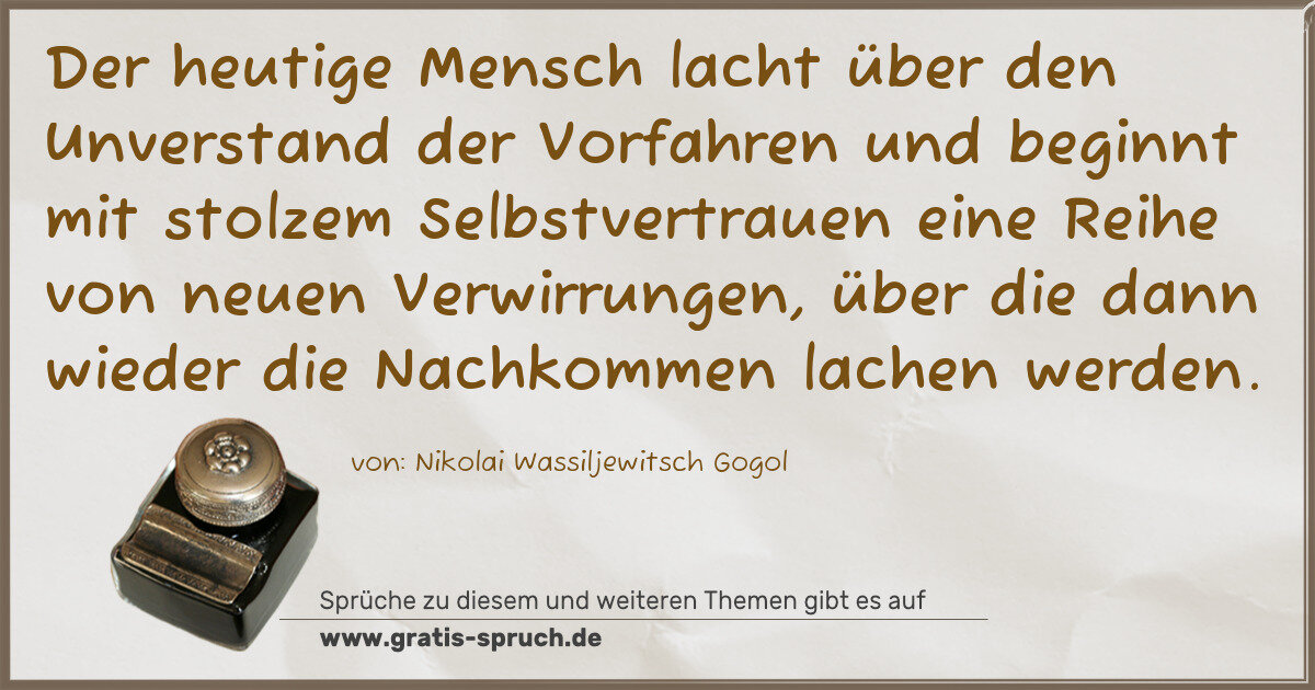 Der heutige Mensch lacht über den Unverstand der Vorfahren und beginnt mit stolzem Selbstvertrauen eine Reihe von neuen Verwirrungen, über die dann wieder die Nachkommen lachen werden.