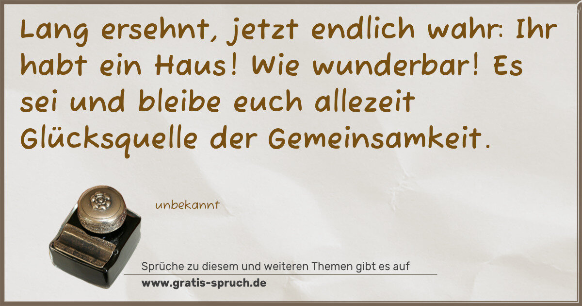 Lang ersehnt, jetzt endlich wahr: Ihr habt ein Haus! Wie wunderbar! Es sei und bleibe euch allezeit Glücksquelle der Gemeinsamkeit.