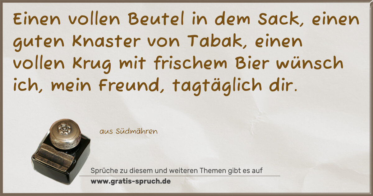 Einen vollen Beutel in dem Sack, einen guten Knaster von Tabak, einen vollen Krug mit frischem Bier wünsch ich, mein Freund, tagtäglich dir.