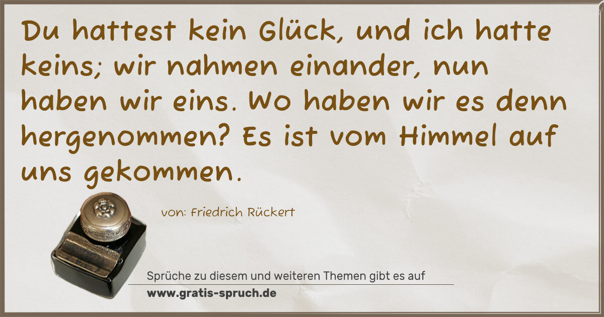 Du hattest kein Glück, und ich hatte keins; wir nahmen einander, nun haben wir eins. Wo haben wir es denn hergenommen? Es ist vom Himmel auf uns gekommen.