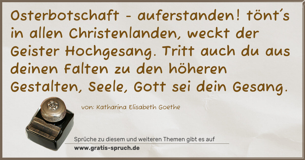 Osterbotschaft - auferstanden! tönt's in allen Christenlanden, weckt der Geister Hochgesang. Tritt auch du aus deinen Falten zu den höheren Gestalten, Seele, Gott sei dein Gesang.