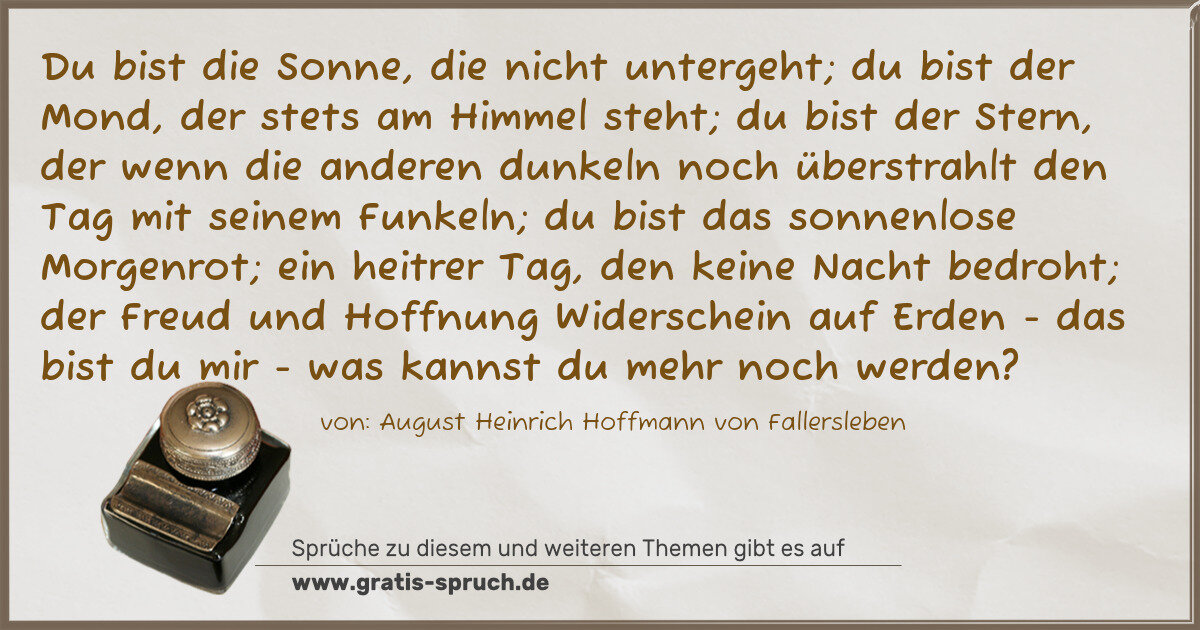 Du bist die Sonne, die nicht untergeht; du bist der Mond, der stets am Himmel steht; du bist der Stern, der wenn die anderen dunkeln noch überstrahlt den Tag mit seinem Funkeln; du bist das sonnenlose Morgenrot; ein heitrer Tag, den keine Nacht bedroht; der Freud und Hoffnung Widerschein auf Erden - das bist du mir - was kannst du mehr noch werden?
