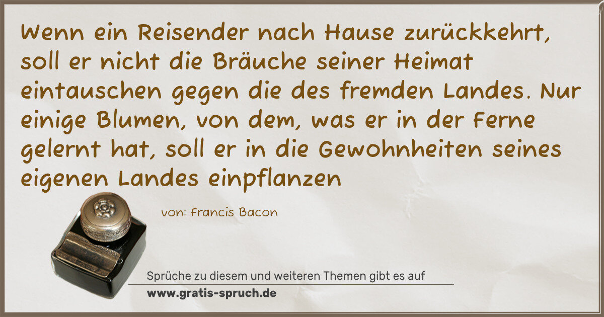 Wenn ein Reisender nach Hause zurückkehrt, soll er nicht die Bräuche seiner Heimat eintauschen gegen die des fremden Landes. Nur einige Blumen, von dem, was er in der Ferne gelernt hat, soll er in die Gewohnheiten seines eigenen Landes einpflanzen