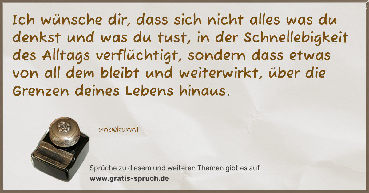 Ich wünsche dir, dass sich nicht alles was du denkst und was du tust, in der Schnellebigkeit des Alltags verflüchtigt, sondern dass etwas von all dem bleibt und weiterwirkt, über die Grenzen deines Lebens hinaus.
