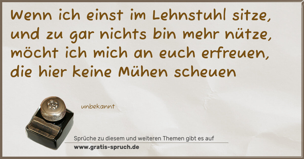 Wenn ich einst im Lehnstuhl sitze, und zu gar nichts bin mehr nütze, möcht ich mich an euch erfreuen, die hier keine Mühen scheuen