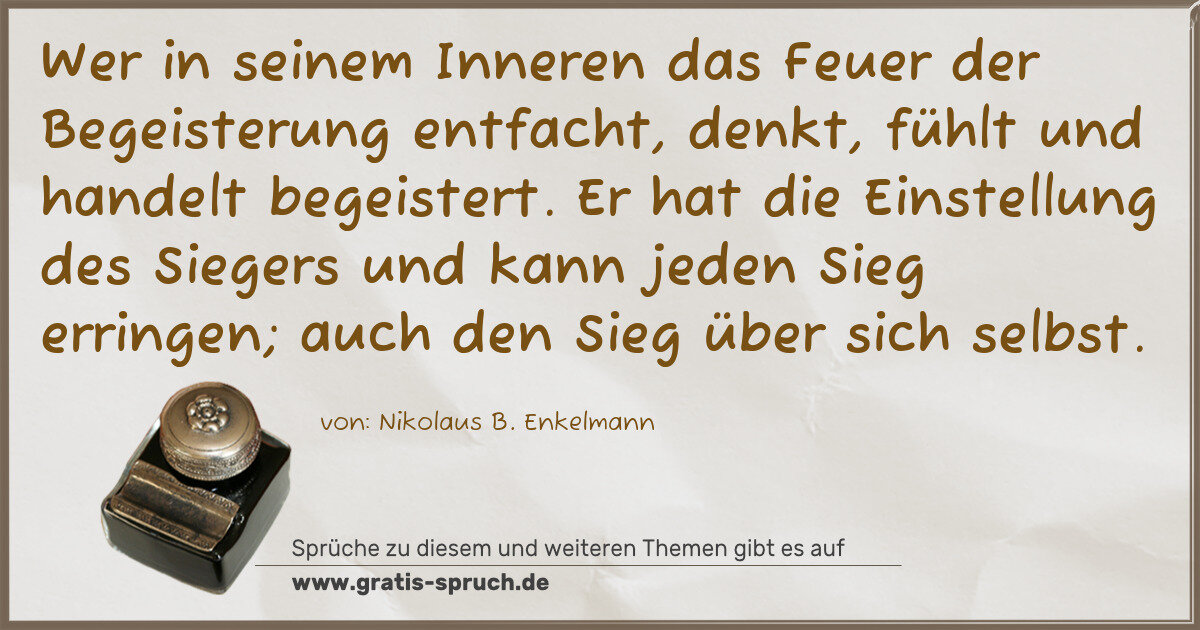 Wer in seinem Inneren das Feuer der Begeisterung entfacht, denkt, fühlt und handelt begeistert. Er hat die Einstellung des Siegers und kann jeden Sieg erringen; auch den Sieg über sich selbst.