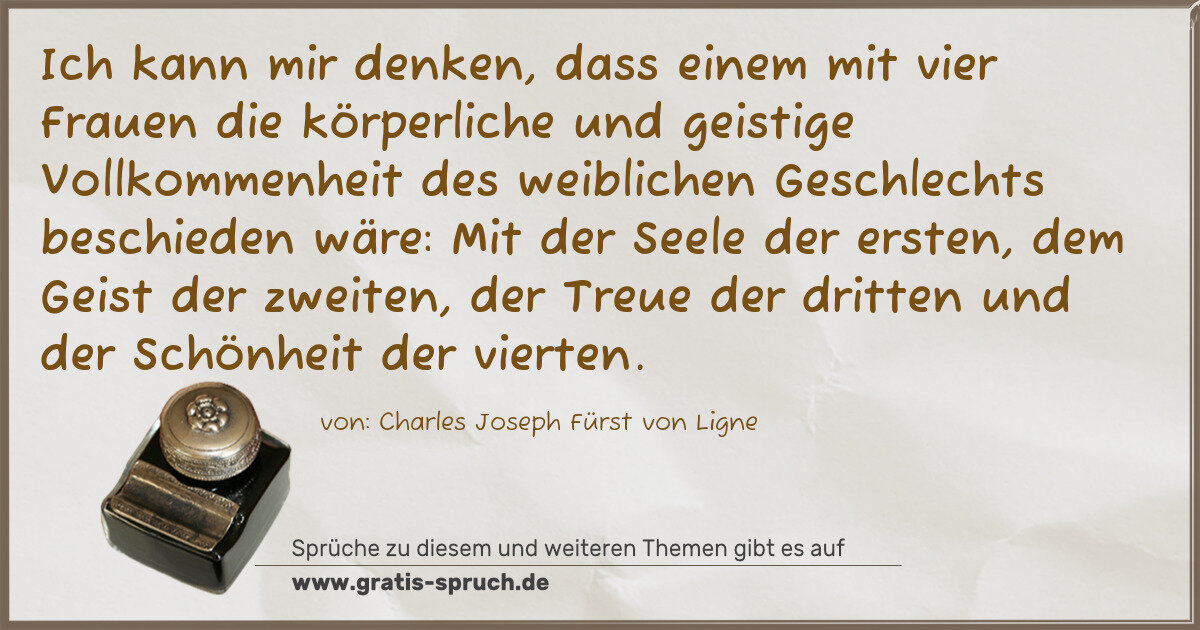 Ich kann mir denken, dass einem mit vier Frauen die körperliche und geistige Vollkommenheit des weiblichen Geschlechts beschieden wäre: Mit der Seele der ersten, dem Geist der zweiten, der Treue der dritten und der Schönheit der vierten.