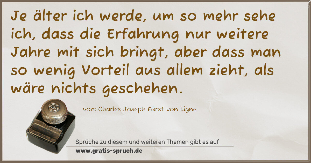 Je älter ich werde, um so mehr sehe ich, dass die Erfahrung nur weitere Jahre mit sich bringt, aber dass man so wenig Vorteil aus allem zieht, als wäre nichts geschehen.