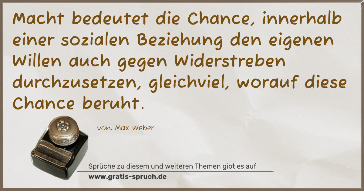 Macht bedeutet die Chance, innerhalb einer sozialen Beziehung den eigenen Willen auch gegen Widerstreben durchzusetzen, gleichviel, worauf diese Chance beruht.