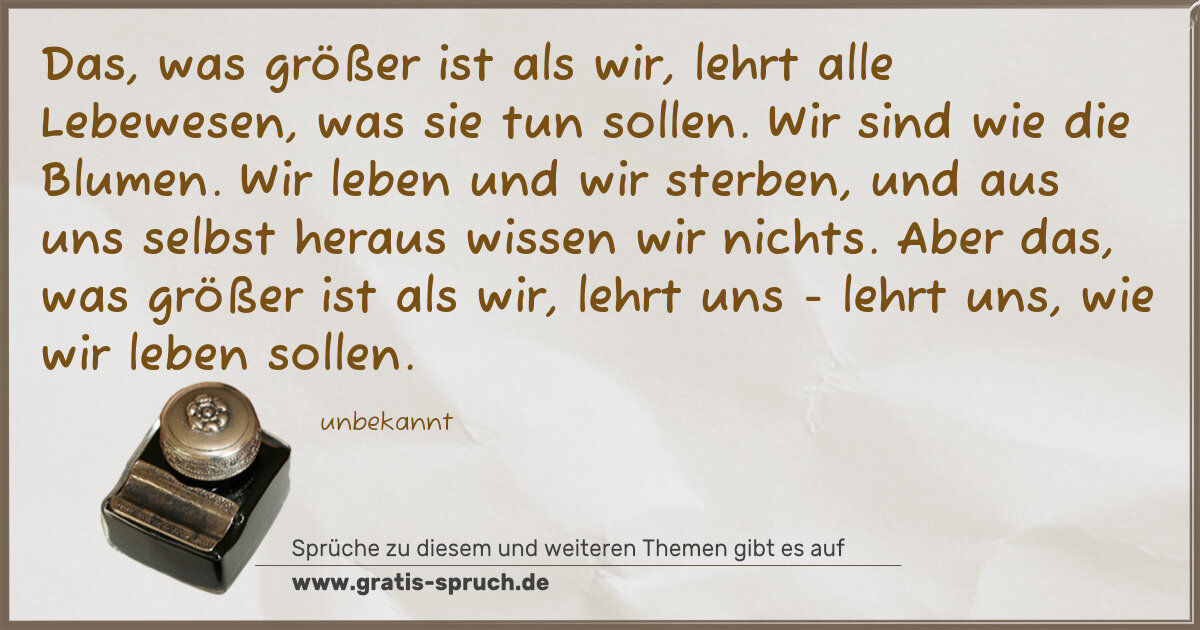 Das, was größer ist als wir, lehrt alle Lebewesen, was sie tun sollen. Wir sind wie die Blumen. Wir leben und wir sterben, und aus uns selbst heraus wissen wir nichts. Aber das, was größer ist als wir, lehrt uns - lehrt uns, wie wir leben sollen.