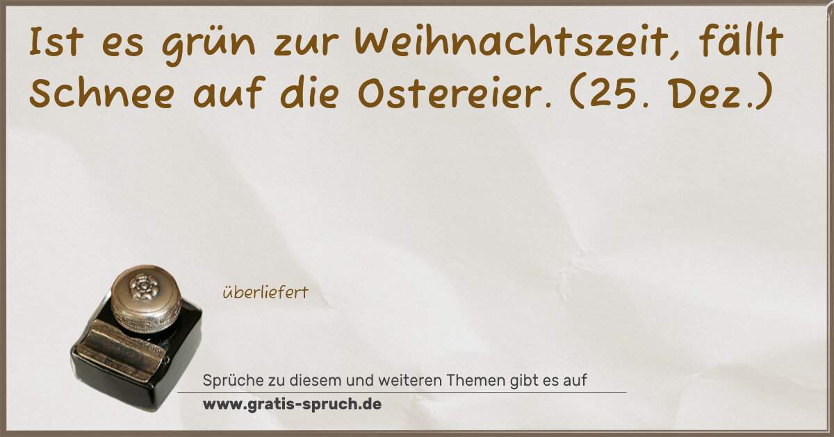 ❝Ist es grün zur Weihnachtszeit, fällt Schnee auf die Ostereier. (25. Dez.)ThemenDezemberSchneeWetterWeitere Dezember Sprüche →Ähnliche SprücheSäen am 1. April, verdirbt den Bauern mit Stumpf und Stiel.Im Februar Schnee und Eis macht den Sommer heiß.Leinsamen säen an St. Ezechiel, dem 100, Tag nach Neujahr, so gedeiht er wunderbar. (10. April)Auf einen dunklen Dezember folgt ein fruchtbares Jahr.