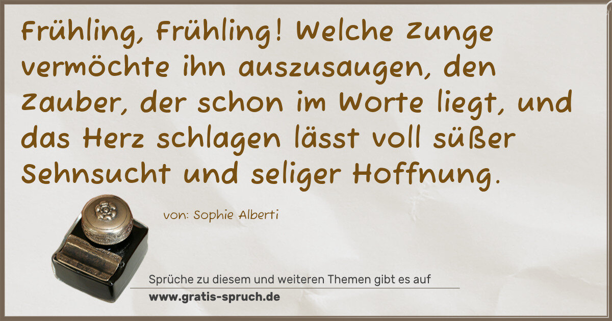 Frühling, Frühling! Welche Zunge vermöchte ihn auszusaugen, den Zauber, der schon im Worte liegt, und das Herz schlagen lässt voll süßer Sehnsucht und seliger Hoffnung.