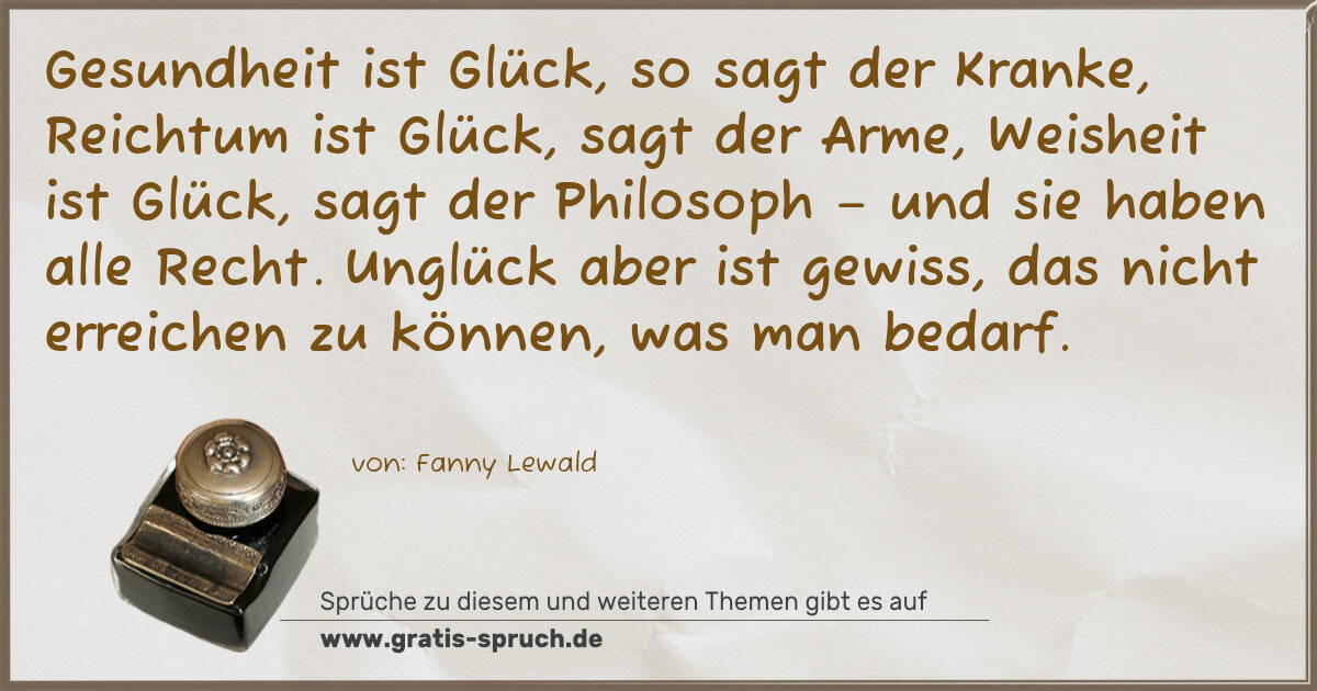 Gesundheit ist Glück, so sagt der Kranke, Reichtum ist Glück, sagt der Arme, Weisheit ist Glück, sagt der Philosoph – und sie haben alle Recht. Unglück aber ist gewiss, das nicht erreichen zu können, was man bedarf.