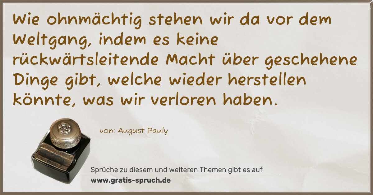 Wie ohnmächtig stehen wir da vor dem Weltgang, indem es keine rückwärtsleitende Macht über geschehene Dinge gibt, welche wieder herstellen könnte, was wir verloren haben.