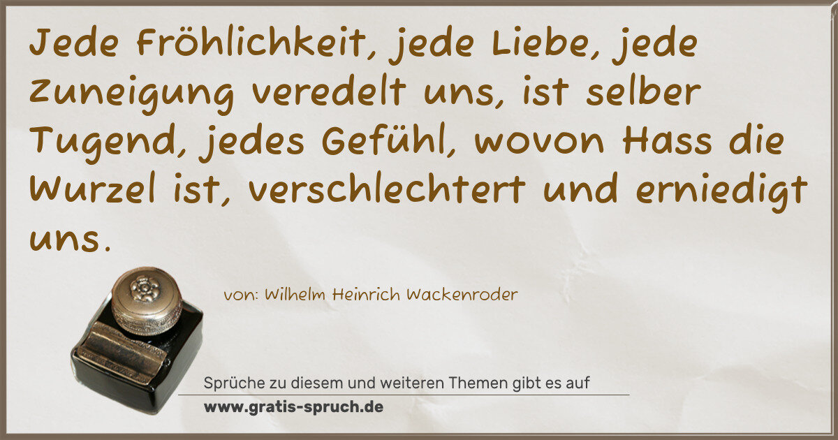 Jede Fröhlichkeit, jede Liebe, jede Zuneigung veredelt uns, ist selber Tugend, jedes Gefühl, wovon Hass die Wurzel ist, verschlechtert und erniedigt uns.