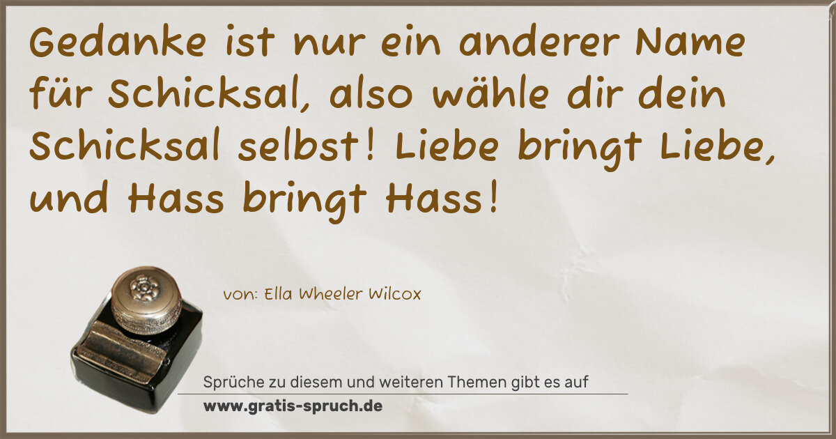 Gedanke ist nur ein anderer Name für Schicksal, also wähle dir dein Schicksal selbst! Liebe bringt Liebe, und Hass bringt Hass!
