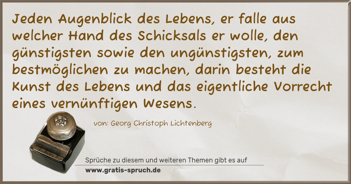 Jeden Augenblick des Lebens, er falle aus welcher Hand des Schicksals er wolle, den günstigsten sowie den ungünstigsten, zum bestmöglichen zu machen, darin besteht die Kunst des Lebens und das eigentliche Vorrecht eines vernünftigen Wesens.