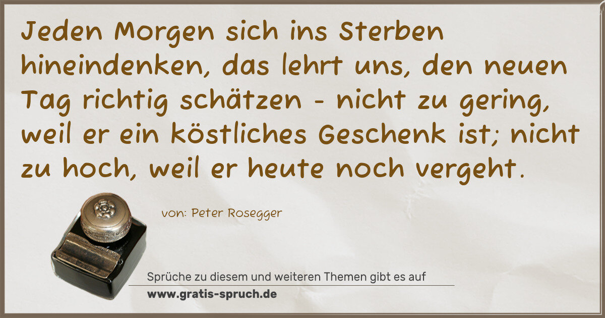Jeden Morgen sich ins Sterben hineindenken, das lehrt uns, den neuen Tag richtig schätzen - nicht zu gering, weil er ein köstliches Geschenk ist; nicht zu hoch, weil er heute noch vergeht.