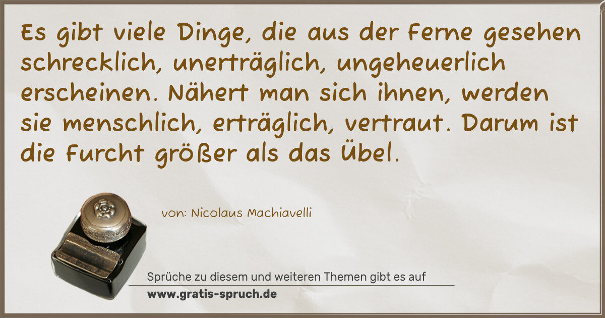 Es gibt viele Dinge, die aus der Ferne gesehen schrecklich, unerträglich, ungeheuerlich erscheinen. Nähert man sich ihnen, werden sie menschlich, erträglich, vertraut. Darum ist die Furcht größer als das Übel.