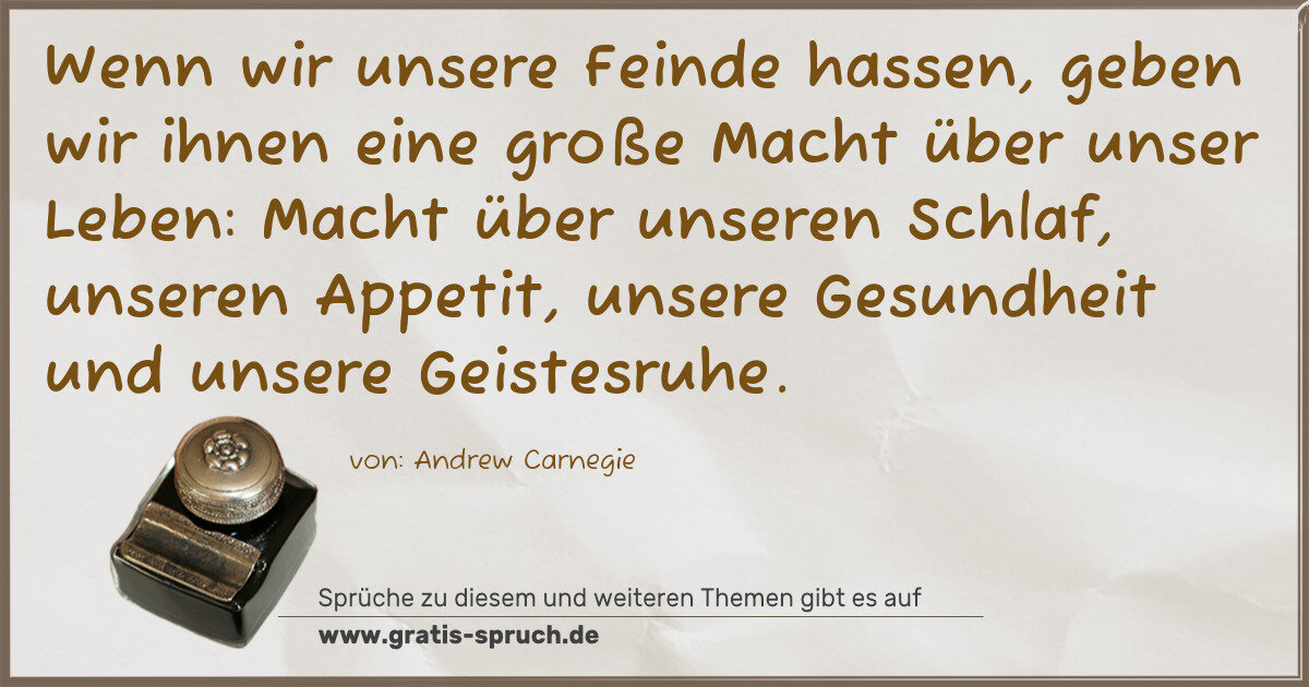 Wenn wir unsere Feinde hassen, geben wir ihnen eine große Macht über unser Leben: Macht über unseren Schlaf, unseren Appetit, unsere Gesundheit und unsere Geistesruhe.