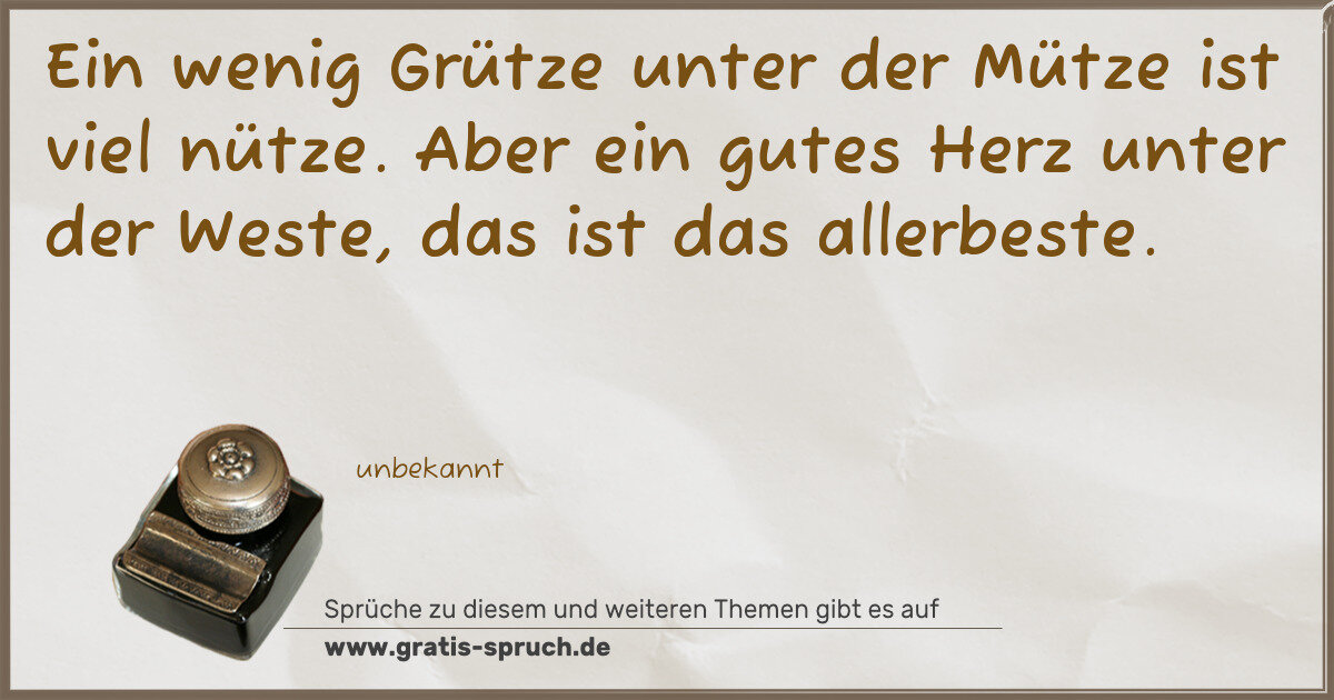 Ein wenig Grütze unter der Mütze ist viel nütze. Aber ein gutes Herz unter der Weste, das ist das allerbeste.