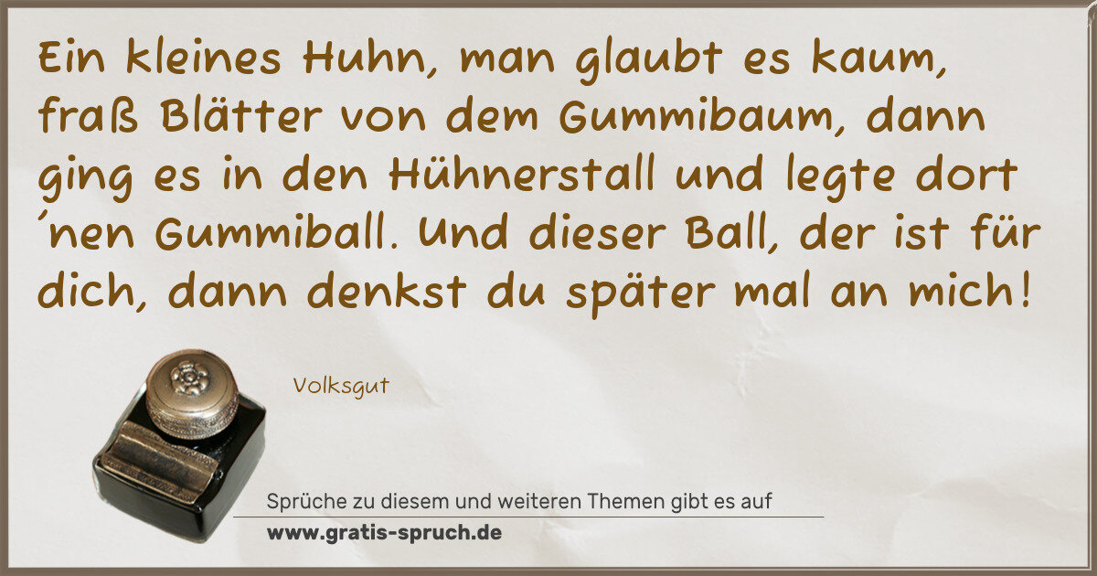 Ein kleines Huhn, man glaubt es kaum, fraß Blätter von dem Gummibaum, dann ging es in den Hühnerstall und legte dort 'nen Gummiball. Und dieser Ball, der ist für dich, dann denkst du später mal an mich!