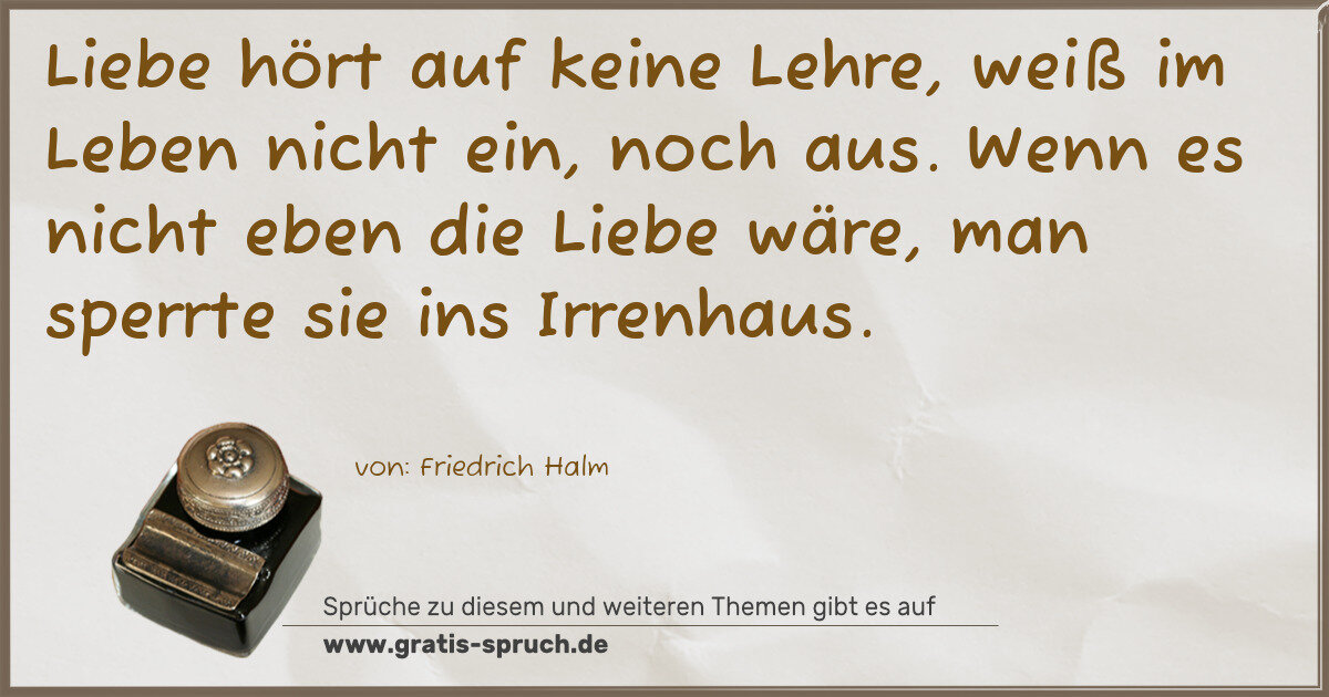 Liebe hört auf keine Lehre, weiß im Leben nicht ein, noch aus. Wenn es nicht eben die Liebe wäre, man sperrte sie ins Irrenhaus.