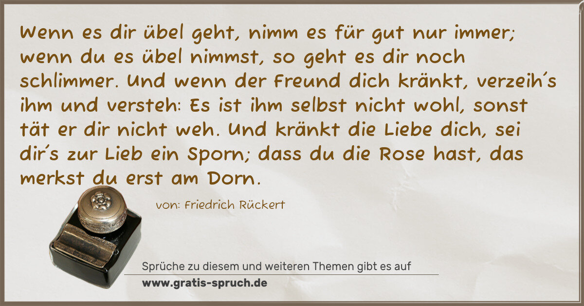 Wenn es dir übel geht, nimm es für gut nur immer; wenn du es übel nimmst, so geht es dir noch schlimmer. Und wenn der Freund dich kränkt, verzeih's ihm und versteh: Es ist ihm selbst nicht wohl, sonst tät er dir nicht weh. Und kränkt die Liebe dich, sei dir's zur Lieb ein Sporn; dass du die Rose hast, das merkst du erst am Dorn.