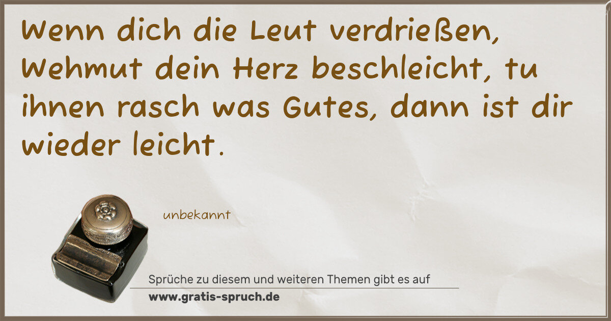 Wenn dich die Leut verdrießen, Wehmut dein Herz beschleicht, tu ihnen rasch was Gutes, dann ist dir wieder leicht.