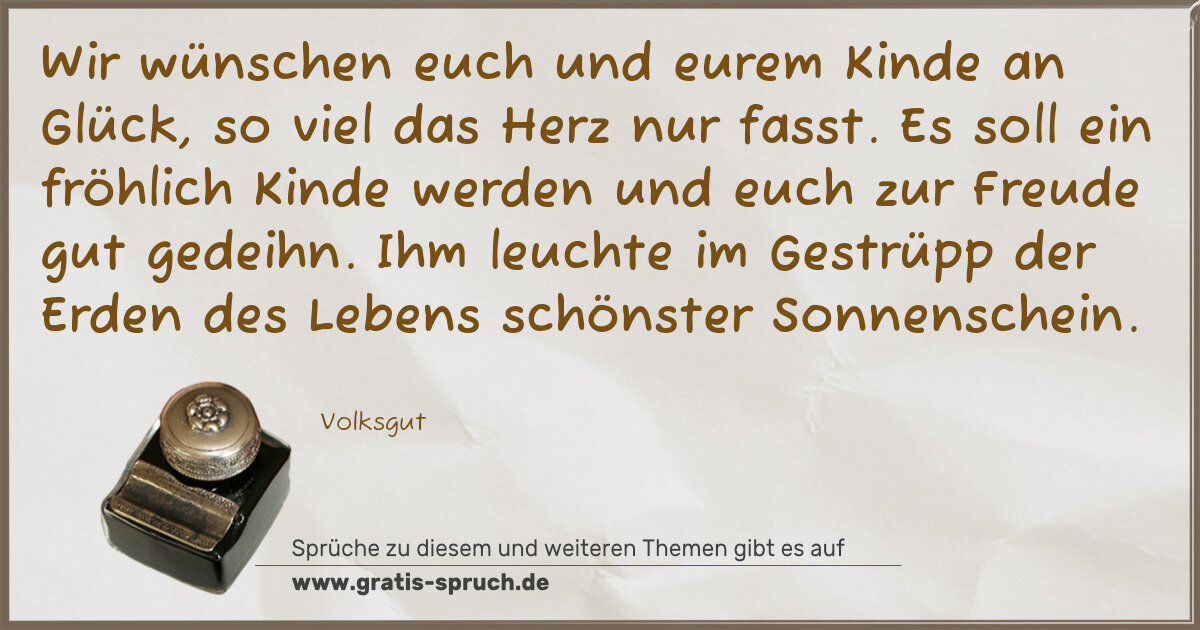Wir wünschen euch und eurem Kinde an Glück, so viel das Herz nur fasst. Es soll ein fröhlich Kinde werden und euch zur Freude gut gedeihn. Ihm leuchte im Gestrüpp der Erden des Lebens schönster Sonnenschein.