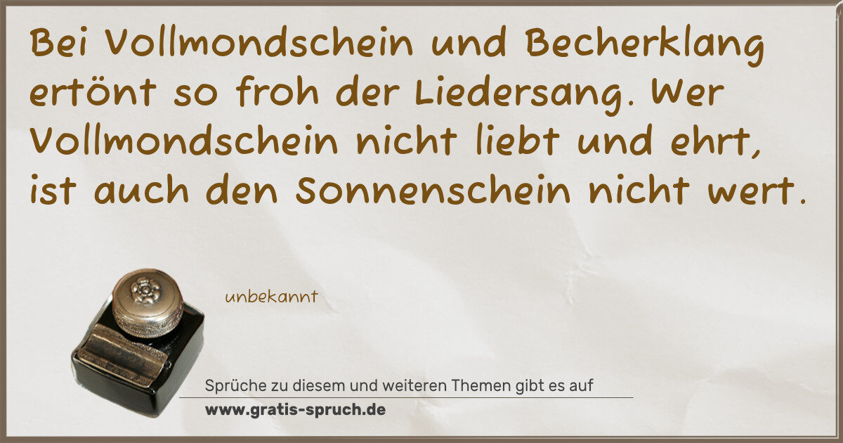 Bei Vollmondschein und Becherklang ertönt so froh der Liedersang. Wer Vollmondschein nicht liebt und ehrt, ist auch den Sonnenschein nicht wert.
