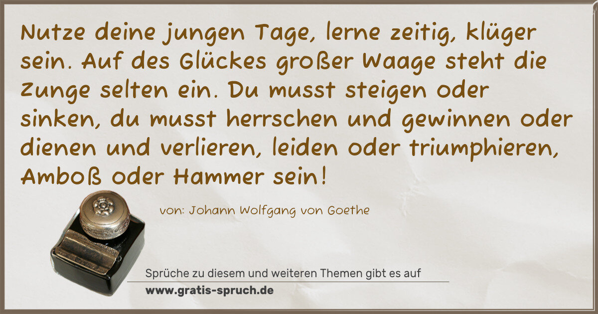 Nutze deine jungen Tage, lerne zeitig, klüger sein. Auf des Glückes großer Waage steht die Zunge selten ein. Du musst steigen oder sinken, du musst herrschen und gewinnen oder dienen und verlieren, leiden oder triumphieren, Amboß oder Hammer sein!