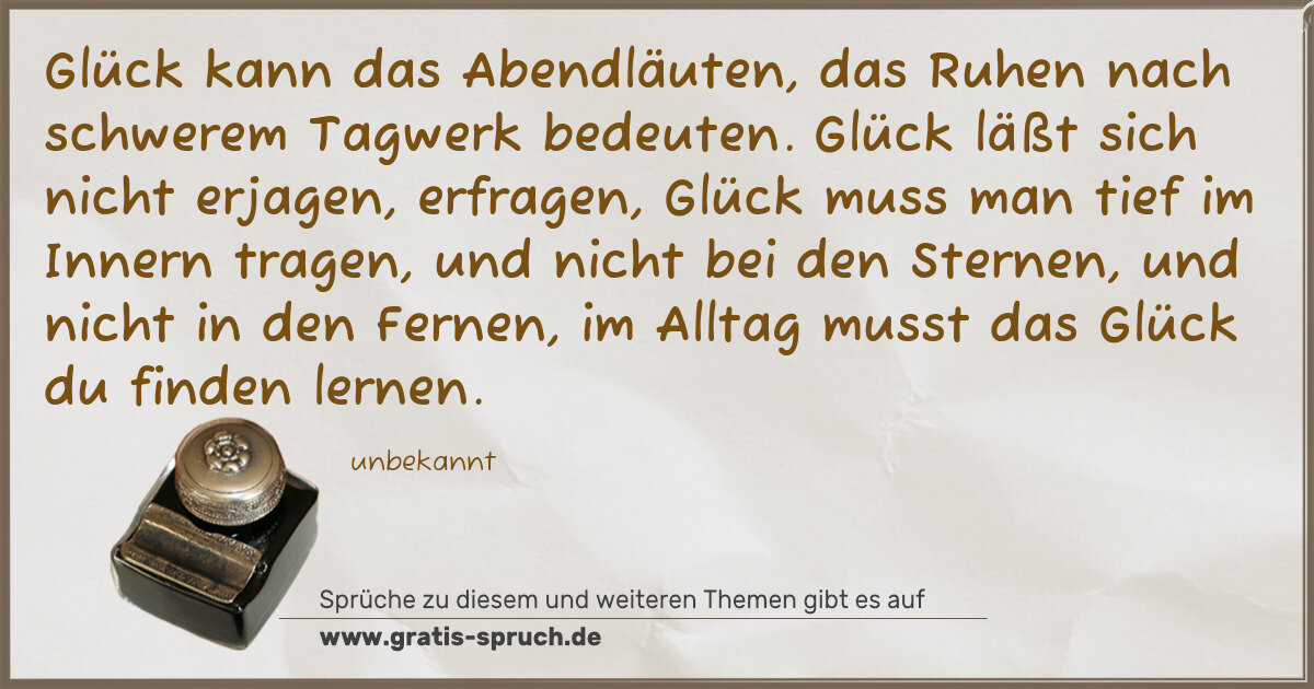 Glück kann das Abendläuten, das Ruhen nach schwerem Tagwerk bedeuten. Glück läßt sich nicht erjagen, erfragen, Glück muss man tief im Innern tragen, und nicht bei den Sternen, und nicht in den Fernen, im Alltag musst das Glück du finden lernen.
