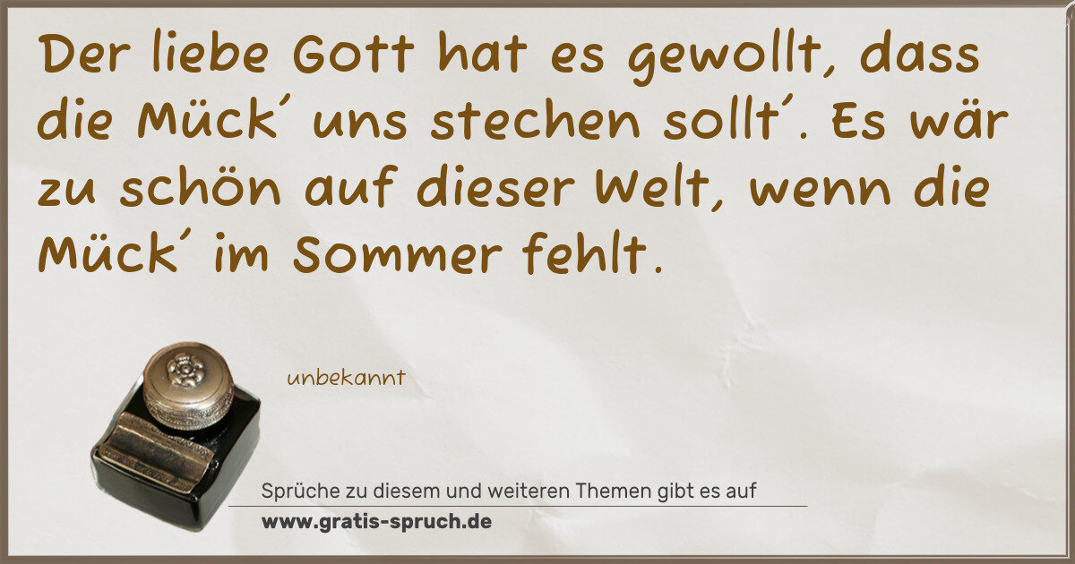 Der liebe Gott hat es gewollt, dass die Mück' uns stechen sollt'. Es wär zu schön auf dieser Welt, wenn die Mück' im Sommer fehlt.