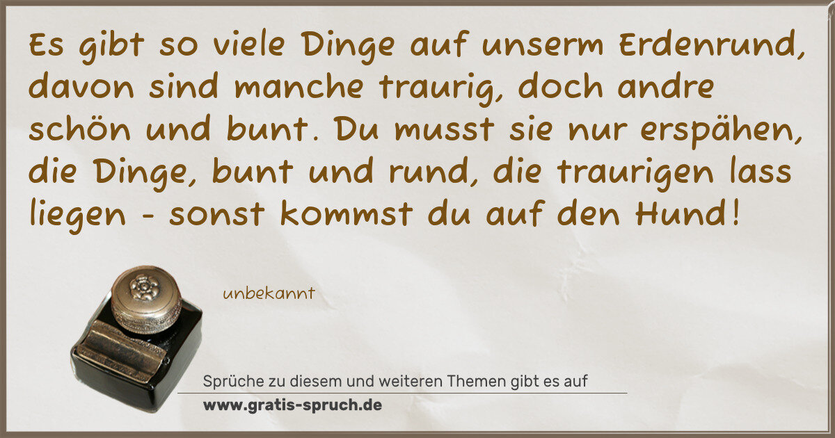 Es gibt so viele Dinge auf unserm Erdenrund, davon sind manche traurig, doch andre schön und bunt. Du musst sie nur erspähen, die Dinge, bunt und rund, die traurigen lass liegen - sonst kommst du auf den Hund!